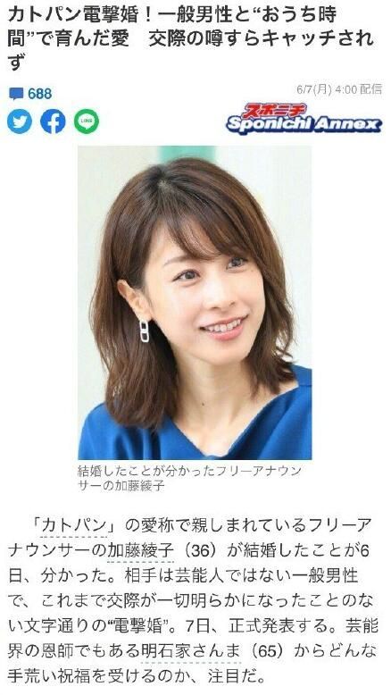 日本著名主持人加藤绫子结婚 对象为圈外男士
