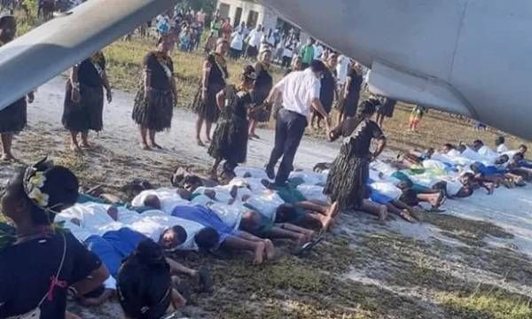 在这张模糊不清的照片中,马拉凯环礁岛民正在欢迎中国驻基里巴斯大使来到该岛。一队年轻人脸朝下趴在地上,让刚下飞机的大使及其同事踩在他们背上通过。