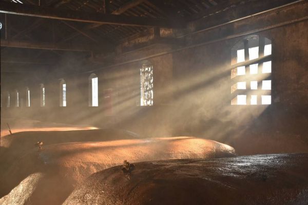 和春酿一样宝贵的还有春曲,又称桃花曲。轻轻掀开制曲室门帘,室内热气立刻扑面而来。“古法制曲”讲究顺应天时,手工操作,制曲师傅不断“翻、堆、烘、晾”让酿酒菌群富集在曲砖上,达到自然接种,自然升温的古法制曲效果。一块桃花春曲要历经4-6个月才能合格,待花凋春毕师傅们又要着手制作“伏曲”,双曲秘制搭配使用才能成为全兴的酒之骨。