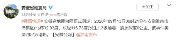 记者从安徽省地震局获悉,安徽省地震台网正式测定:2020年09月13日09时21分在安徽淮南市潘集区(北纬32.93度,东经116.73度)发生1.3级地震,震源深度0公里,该事件类型判定为塌陷。
