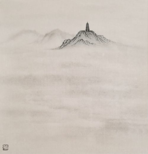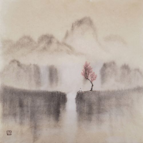 师引先生的作品中常常是一人独行,自省深沉,寥寥数笔刻画人物轮廓,而不具五官样貌,形意点到爲止,背景空旷,更显天地之苍茫。