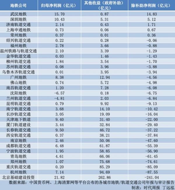 不过,北京地铁的其他收益达到262.86亿元,两相减除后,北京地铁除补助净利润为-241.04亿元,成为了唯一亏损超百亿的城市。