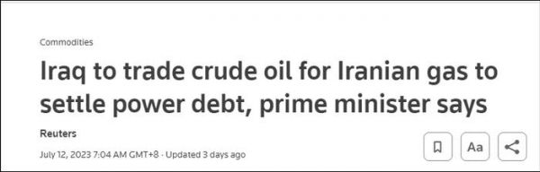 路透社:伊拉克总理表示,将同伊朗开展油换气交易以解决电力欠账路透社7月12日报道称,伊拉克有三分之一到四成电力供应来自伊朗,包括直接从伊朗进口电力或通过进口天然气来发电,伊拉克每年在进口伊朗天然气和电力上花费约40亿美元。在伊拉克部分地区突破50摄氏度的酷热天气下,伊朗的能源供应对伊拉克民生而言尤其重要。