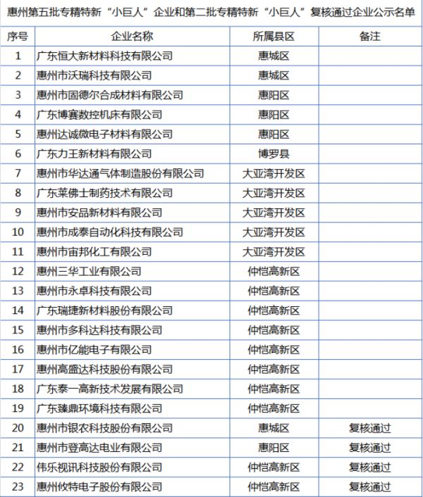 惠州第五批专精特新“小巨人”企业和第二批专精特新“小巨人”复核通过企业公示名单。