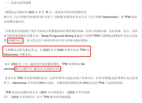 根据洛阳钼业7月18日公告,各方约定以下事项并将对合资文件做出相应更新:和解总金额达8亿美元;自2023年(含)起的项目现有服务期内,TFM承诺将向Gécamines累计分配至少12亿美元的股东分红;各方在TFM未来再增储权益金、运营管理等方面也达成了多项共识。在符合刚果(金)法律和公允定价条件下,Gécamines享有项目20%分包权,并拥有按其股权比例20%对应的TFM产品的包销权。