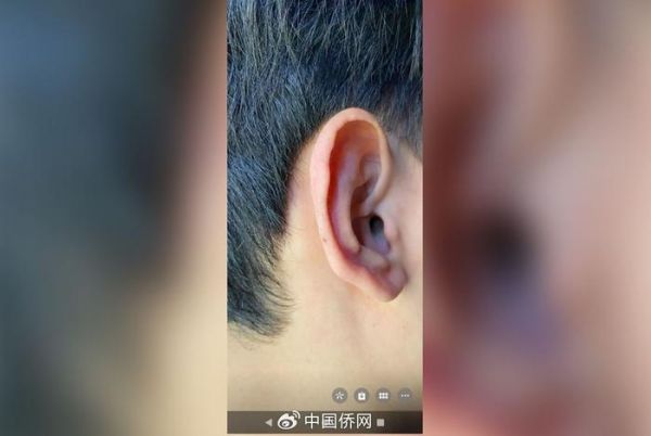 冯先生被打后,耳朵通红,耳鸣想吐。(美国《世界日报》/冯先生提供)