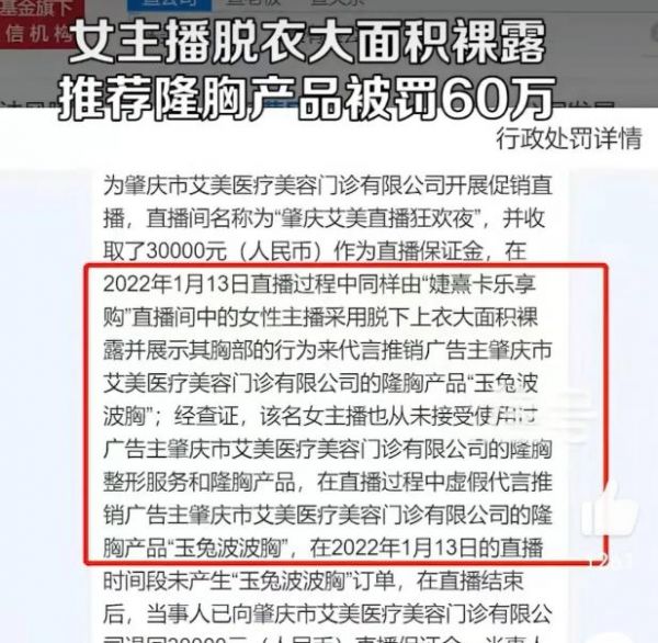 今天,一位主播因在直播中大面积裸露推荐隆胸产品而被罚款的消息,登上了热搜,引起了公众的广泛关注。这种行为不仅违反了直播平台的规则,也违反了法律法规,涉事公司被当地市场监管局罚款60万。