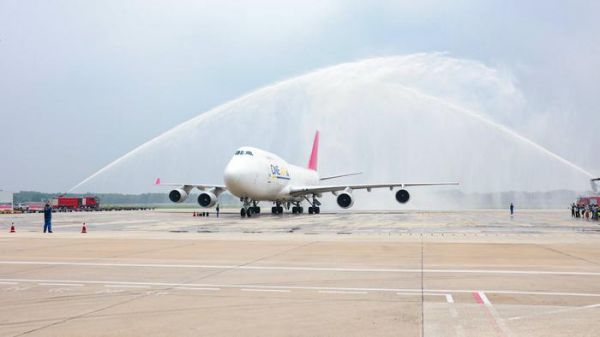齐鲁网·闪电新闻7月23日讯 7月23日,一架B744F全货机航班平稳降落在山东省机场管理集团济南机场,随着飞机缓缓穿过代表民航最高礼仪的“水门”,标志着山东省唯一直飞英国伦敦的全货机航线正式运行。