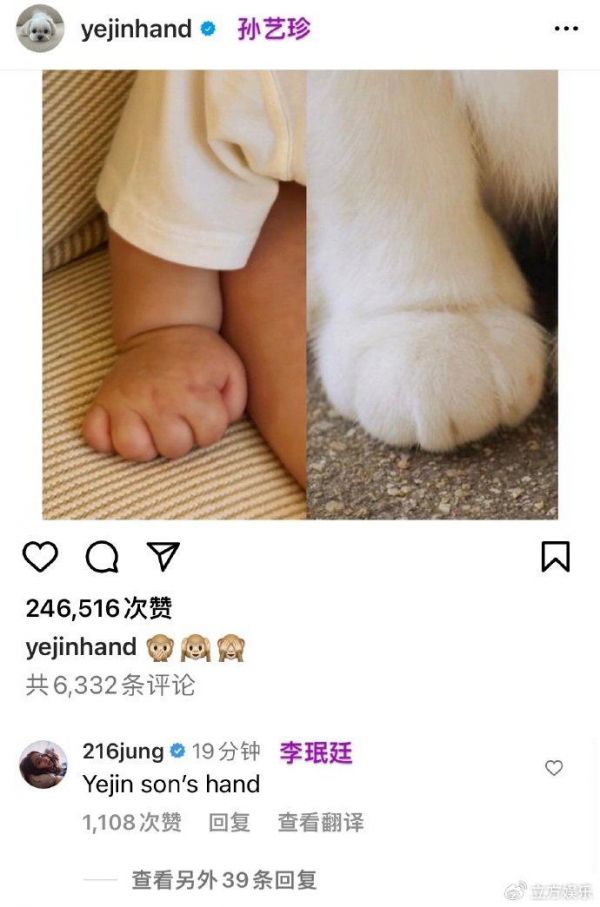 25日,孙艺珍更新ins,晒出儿子小手,还放了和小猫的爪子对比……
