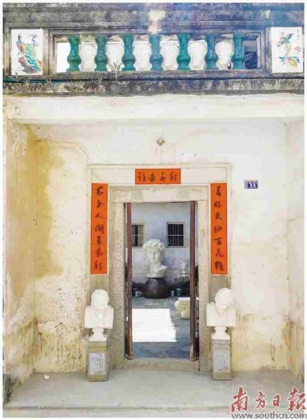 大卫塑像安放在倒扣的水缸上,两个伏尔泰石膏像分置柴门两旁,成排的人物塑像隔着老式栏杆张望。希腊雕塑、潮汕老厝,两个相距甚远的事物在这里巧妙结合,一切看似格格不入,却又合乎常理。