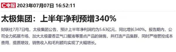 据财联社不完全统计,同属中药板块的太极集团、陇神戎发、特一药业、西藏药业、云南白药均于本月发布半年度业绩预告,净利同比增速上限均超100%。其中,太极集团7月7日公告,预计上半年净利润约为5.63亿元,同比增长340%。民生证券王班等人在7月9日发布的研报中表示,太极集团2023Q2业绩大超预期,藿香正气等产品终端需求旺盛。中药类产品的销量快速增长,带动公司营收和业绩双增。太极集团聚焦主业发展,重视规模型大单品,并由大单品带动小单品协同发展。