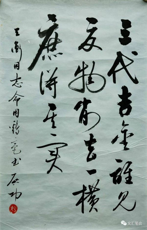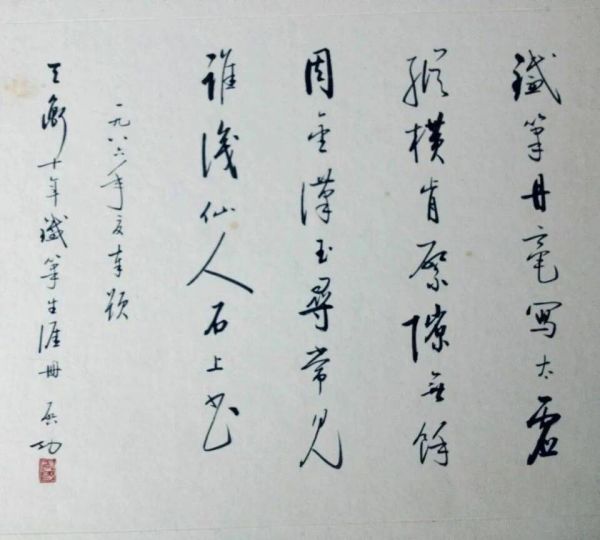 1984年西泠印社春季雅集,启先生也来了。他特意带了一枝罕见的鸡毫笔赠我,这类笔其实作为品种犹可,书写起来却极难驾驭。我得寸进尺地戏言:谢谢礼物,但我更想求您一张用这笔书写的墨宝。启先生竟抽纸蘸墨,立马挥毫写了自撰的“三代吉金谁见夏物,削去一横庶得其实”句赠我(下图)。不可思议的是,这笔在他的腕底居然运用得得心应手,较之平时更见精彩,谚曰“好将不挑抢”,信然。
