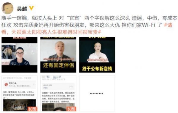 9月13日,演员吴越在社交媒体上发文,针对自媒体传播的恋情与离婚谣言进行了回应,她发文怒斥自媒体的不实报道,并明确表示瞎编传言的行为是对她和朋友的伤害。