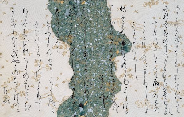 《三十六人家集》的料纸装饰是“装饰”(かざり)与“游戏”(あそび)相结合、高水准的稀世之作。染纸〔日语,即色纸、彩色纸〕的组合形式变幻无限,虚空中漂浮般的折枝、飞蝶、小鸟、红叶等各种饰纹流动不止,加之和歌的散书〔日语,书写和歌时不按行跳跃空开或草体假名和平假名混杂,或淡或浓、或粗或细,书写风格洒脱飘逸〕与之配合勾画出难以言喻的韵律——颜色和形状相得益彰,优雅诙谐的形象尽显其中。一切艺术都趋向音乐的状态,我还未曾见过比这件作品更接近音乐性格的视觉艺术。这是由“物哀”抒情为基础的游戏装饰的世界……
