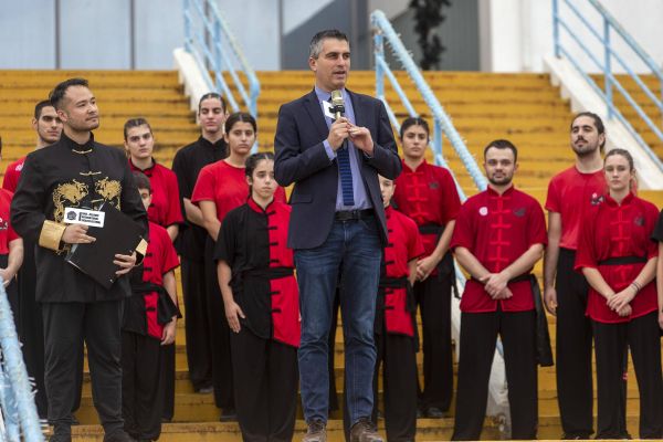 12月2日,希腊文化部副部长赫里斯托斯·季马斯(中)在希腊雅典圣诞剧场举行的“中希国际戏剧节”开幕式上讲话。 新华社发(马里奥斯·罗洛斯摄)