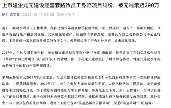 12月14日,浙江乾江源文化艺术发展有限公司在其企业公众号“乾江源文化”发文直指龙元建设“经营套路致员工身陷项目纠纷”。而在记者采访事件核心人物“员工王林”的过程中,王林进一步透露自己“与龙元建设是挂靠关系”。