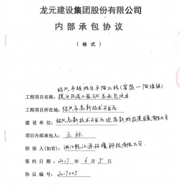 记者从王林处获得了上述项目承包协议。该协议显示,项目甲方为龙元建设,乙方(项目内部承包人)为王林,丙方(乙方担保人)为浙江乾江源环境科技有限公司,建设单位为绍兴高新技术开发区迪荡新城投资发展有限公司(以下简称“迪投公司”),签署时间为2017年6月5日。