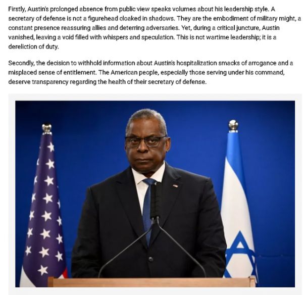 (截图来自《新闻周刊》的报道,下同)这名曾经在奥斯汀担任美军中央司令部司令期间做过他下属、并曾每天向他汇报全球情报的美军老兵,还表示奥斯汀的做法暴露出了4个事关美军领导力乃至美国国家安全的大问题:1、作为美军力量象征的他长时间不在岗、导致领导真空,无法让盟友安心和震慑敌手,是玩忽职守;2、他隐瞒病情是傲慢和耍弄特权;3、其他国防部高级官员长时间对他的病情不知情,说明五角大楼的整个指挥链条出了问题;4、他的健康关系国家安全,可他的安保人员却没有及时通报,这是无法让人接受的不称职。