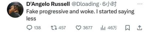 拉塞尔今天发推,转发了一句歌词:“他们假装进步和觉醒,我开始少说多干。”