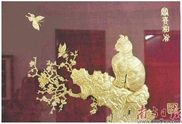 陆丰金属雕以金、银、铜等金属片为雕刻材料,厚度从0.4毫米至0.8毫米不等,能够制作成大小不同、形状各异的各种作品。