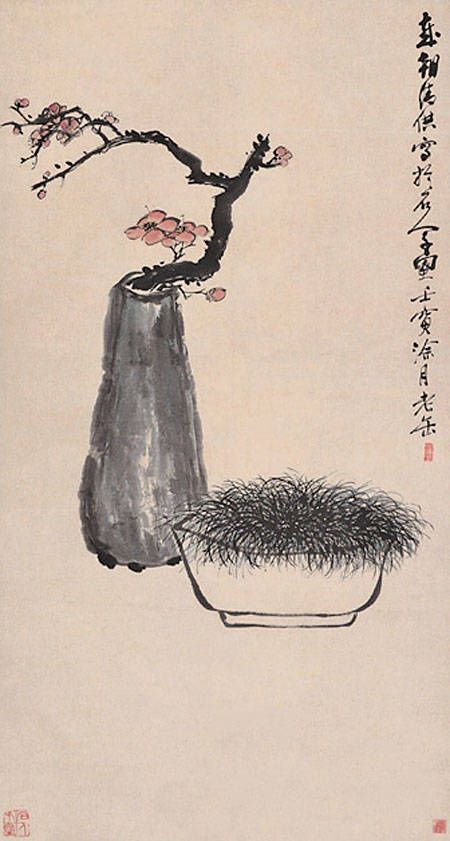 尽管年年画岁朝清供,年年却不重样,金石趣味以及少画牡丹,都形成吴昌硕此类画作的特色。他曾在《缶庐别存》中写道:“凡岁朝图多画牡丹,以富贵名也。予穷居海上,一官如虱,富贵花必不相称,故写梅取有出世姿,写菊取有傲霜骨,读书短檠,我家长物也,此是缶庐中冷淡生活。”吴昌硕绘于1902年的《岁朝清供》(中国美术馆藏),仅画有瓶中的一枝红梅与盆中的一丛蒲草,逸笔草草,有着简约的格局和清雅的意境,可见其文人风骨。相比之下,任伯年的岁朝清供图更为雅俗共赏。他尤善集合数种象征,来寓岁朝之喜庆,画面色彩往往大胆混搭,呈现出一种蓬勃的烟火气。