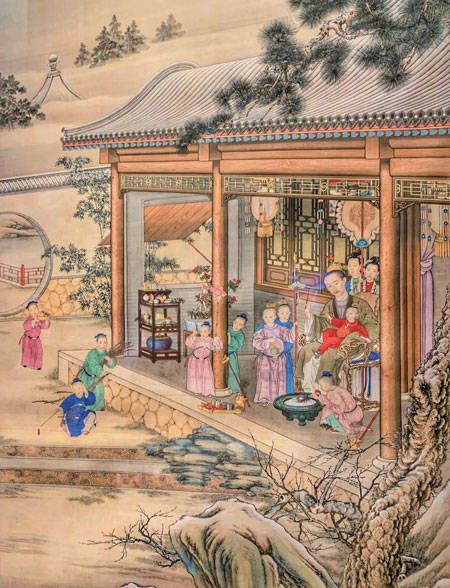 富庶人家过新年,又有怎样的讲究?清代宫廷画家姚文瀚绘有大户家族新春之际于宅院团聚欢庆的《岁朝欢庆图》(台北故宫博物院藏),即展开颇为典型的图景。图中,正厅摆设酒食,长辈们围坐饮宴。家仆或持酒壶侍立,或端送糕果,穿梭于前厅回廊里。在后院偏房里,妇人们在忙碌备餐。远处阁楼上,几位男仆合力悬挂着大灯笼。在庭院中,孩子们一片欢乐喧闹,有燃放爆竹的,有携弄玩偶的,有敲锣打鼓的,有击板小唱的。三进院落,叠石假山,庭院里讲究的红木火盆,正厅中气派的“四季花卉”大立屏、典雅的朱几瓶插牡丹,无不凸显主人的身份,烘托出满堂富贵的年味。