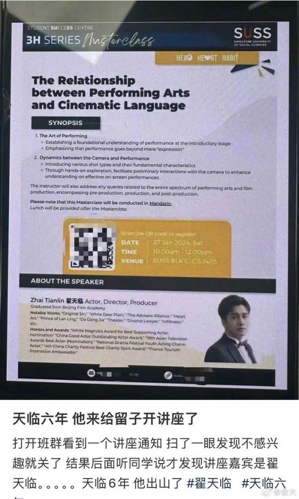 #翟天临与素人合影##翟天临新加坡与素人合影# 翟天临昨日现身新加坡社科大学讲座会,分享了关于表演的感受和知识,并与素人合影。