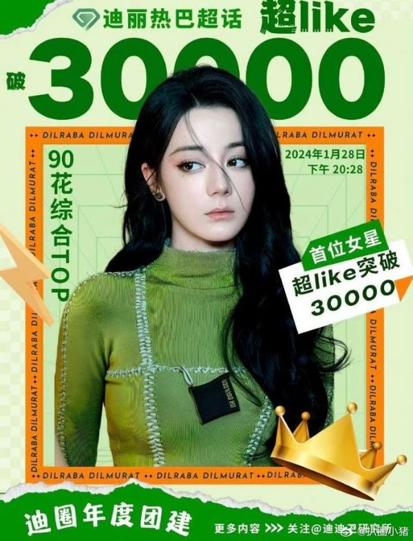 迪丽热巴成为首位超Like破三万的女星……