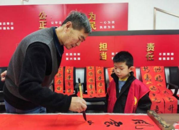 无联不成春,有联春更浓。活动现场,书法家们饱含热情,铺纸研墨,即席挥毫,真草隶篆,或清劲挺健,又柔媚和尘。一起一落间,一幅幅苍劲有力、喜庆洋溢、满载美好祝愿的春联跃然纸上。孩子们在书法家的指导下,聚精会神地铺纸、蘸墨、落笔,一个个毛笔字在一起一落间慢慢成形,传递出浓浓的年味。