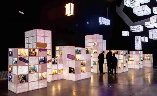 整个展厅的墙面,使用了黑色软质材料做吸光处理,从而突出发光的作品本体和空中悬浮的彩色气泡。这样的设计使观众步入“折叠城市”时,犹如踏入黑夜中的万家灯火,熟悉而又奇妙,也为他们带来了一次陌生又惊喜的视觉体验。