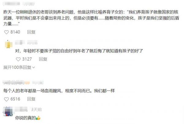这个真的谁都无法预料,所以还是真只能像大叔说的那样“活一天就高兴一天”。还有许多网友因此谈到“孩子”的事,觉得还是应该生儿育女,给自己一个希望,不然年轻时再风光,老了都有可能是个悲剧。