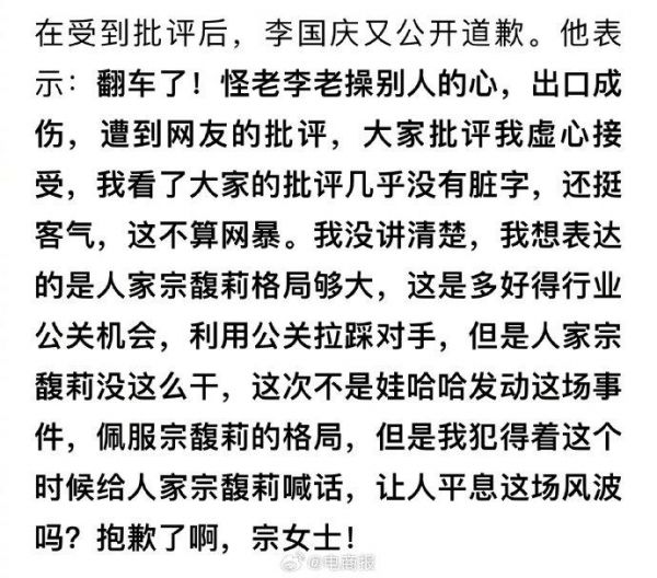 李国庆向宗馥莉道歉,没有说她用公关拉踩农夫山泉的意思…