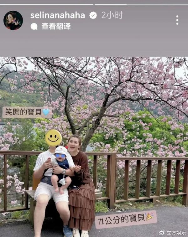 任家萱晒一家三口赏花自拍 公布宝宝已经71公分高
