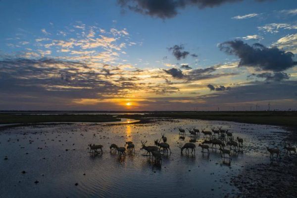 10月7日,江苏省盐城市大丰黄海野麋荡中的麋鹿在湿地中自由地觅食 (图片来源:视觉中国)