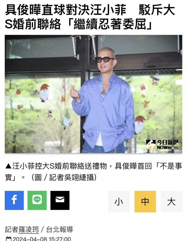 4月8日,据台媒报道,具俊晔回应被汪小菲说大S婚前送礼物到韩国给他,还有被黄子佼指控吸毒等,他予以否认:“这些都不是真的,我也觉得很委屈烦闷,真相自有公道,我早就接受过检验,收礼的部分也非常不像话,但我还是会继续忍耐。 ”