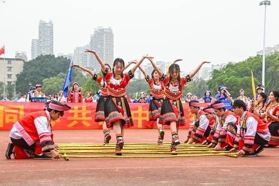 在广西大学“三月三”民族文化体验展示活动的开幕式上,莫夏琳参与了跳竹竿舞的节目。8根长竹竿一开一合,有节奏地发出声响,莫夏琳和伙伴穿着民族服饰在竹竿间灵活地跳动。