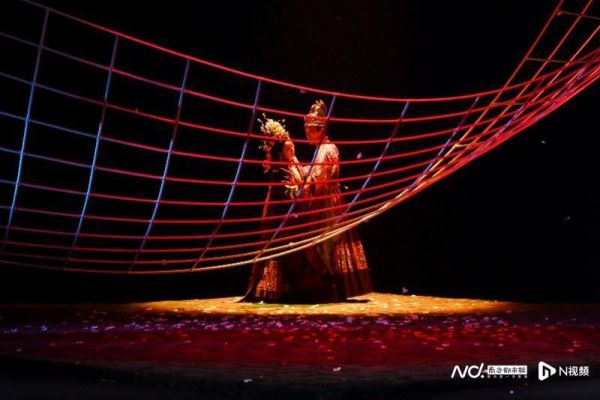 在香气引导下,观众的视线慢慢地投向舞台。舞台上的物件非常少,脚下是一块古老的青砖地面,有着斑斑驳驳的青苔,它是坚实、厚重的历史沉淀,千古带愁;抬头是一个纵横交错的网状天顶,满满承放着唯美却无根无力的花瓣,交织成了一个神圣的空间。无一不在诠释着本剧的理念:诸法空相,唯爱一念。