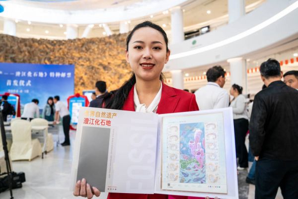 当日,《世界自然遗产——澄江化石地》特种邮票发行仪式在位于云南玉溪的澄江化石地世界自然遗产博物馆举行。此次发行的邮票1套3枚,邮票图案名称为中华微网虫化石、环饰蠕虫与吸盘古宿虫共生化石、延长抚仙湖虫化石。全套邮票面值3.60元,计划发行数量588万套。