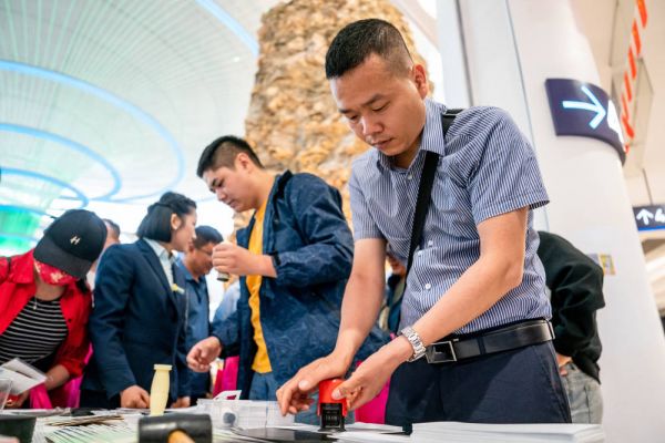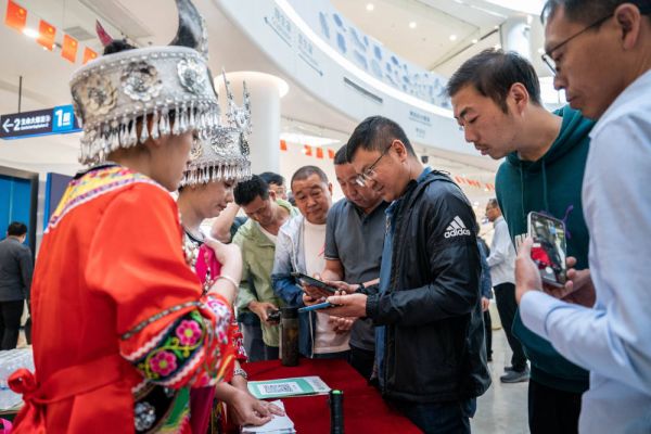 4月18日,人们在澄江化石地世界自然遗产博物馆购买《世界自然遗产——澄江化石地》特种邮票。新华社记者 胡超 摄