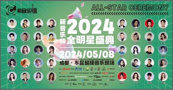 新音乐榜2024全明星盛典将于5月8日在成都东区超级音乐现场举行,包括黄品源、蒲巴甲、唐禹哲、陈志朋、罗中旭、欢子、于冬然、云千千、毕夏、黑龙、曾惜、陈雅森、校长张弛、巴扎黑、夏雨菲、杨小壮、彭筝、姜鹏、千百顺、张北北、吴琳、四川雨泽、陈柏丞、南宫嘉骏、贺敬轩、陈仪朵、胡馨予、江小城、孙艺伟、魏玉慧、贺七七、莎妞妞、钟羽善、范佳琪、昆霓、慕容景天、李乐乐、潘兴源、大哲、周以希、刘芊瑩、李晓宁等近50组知名艺人出席盛典。