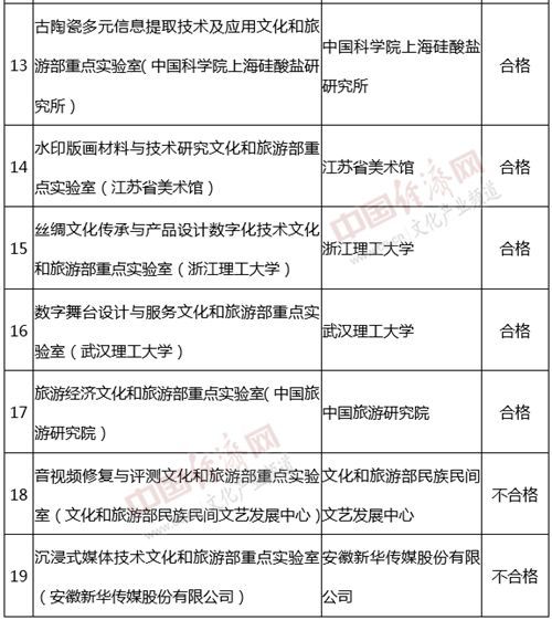 经济日报-中国经济网北京11月10日讯 11月9日,文化和旅游部科技教育司公示了文化和旅游部重点实验室评估结果,17家单位评估结果为“合格”,2家单位评估结果为“不合格”。