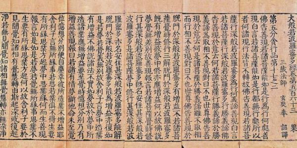 当历史迈进21世纪,时针指向2001年7月初,我时任北京海王村拍卖公司经理,无意间从客户的交谈中隐约听到境外发现一批中国的佛经,收藏人正欲转让。这是哪部佛经?是哪个年代刊印的?国内是否有藏?数量有多少?7月8日,我接到了一份境外发来的传真,上面写着“大般若”三字,15册经卷名及千字文排序号。这些简单的文字,无法帮助我判断这是哪个年代的刻经,更不清楚这是单刻经还是大藏经中的一部分。于是我立刻回函,是否可邮寄过来一册实物。几天后,一封特快邮件送到了我的办公桌上,打开一看,果然是一册折装佛经。细细查看,佛经首行印有“大般若波罗蜜多经”及卷数、千字文排序号等字,第二行印“三藏法师玄奘奉诏译”九字,第三行为经文的品名。经文整版5个折页,每折页6行,行17字,无行界,在每块经版相互连接处,即每版页首可见“般若”二字以及卷数、千字文排序号和刻工名。藏经纸刷印,纸质厚实坚挺,可见约一指半宽帘纹。翻看佛经的背面,发现凡偏瘦柳体字经文虽然墨色依旧浓黑,但墨不透纸;而字体肥厚的颜体字经文,则基本上均是墨色透纸。明显可看出这是刷印时由于经版新旧程度不同所造成的。佛经保存完好,丝毫没有虫蛀的残缺,也没有水湿痕迹的留存,用“触手如新”来形容丝毫不为过。