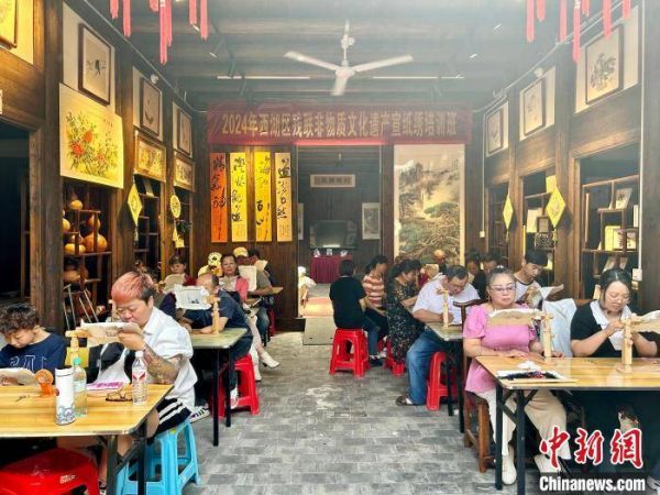 在江西南昌绳金塔历史文化街区,沿着街区往里走,来到2024年西湖区残联非物质文化遗产宣纸绣培训班。穿针引线,巧织经纬,二十余名“绣娘”一针一线在宣纸上勾勒刺绣作品。