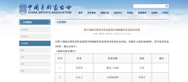 近日,中国美术家协会官网公布,第十四届全国美术作品展览中国画展区作品复评结果。经第十四届全国美术作品展览中国画展区作品复评评审委员会评选,共有698件作品入选,其中进京作品103件。