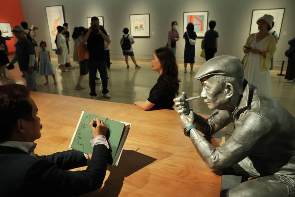 在展厅内,有一方长桌,由雕塑家许鸿飞创作的黄永玉像手拿烟斗,坐在桌边,神情怡然。不时有观众在雕像的旁边坐下来,似乎随时可以与他闲谈。许鸿飞与黄永玉有着亦师亦友的交往,当他提出为黄永玉塑像时,黄永玉选择展现自己生活化的一面,不希望把自己塑造成“纪念像”。“看着他的塑像,我感觉还是那么亲切,就像他依然在。”许鸿飞回忆,在黄永玉98岁时,两人见面,当时黄老正准备自己的百岁新作展,“他希望能拿出全新面貌的作品展出,不想‘倚老卖老’。这种求新求变的精神,让我至今都感觉很受鞭策。”