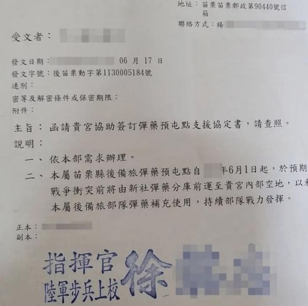 苗栗县后备指挥部6月17日的函文显示,该函主旨为函请某宫庙协助签订弹药预屯点支援协定书。公文称,苗栗县后备旅弹药预屯点今年6月1日起,“预期战争冲突前”,将由新社分库前运至宫庙内部空地,以便后备旅部队弹药补充使用,持续部队战力发挥。