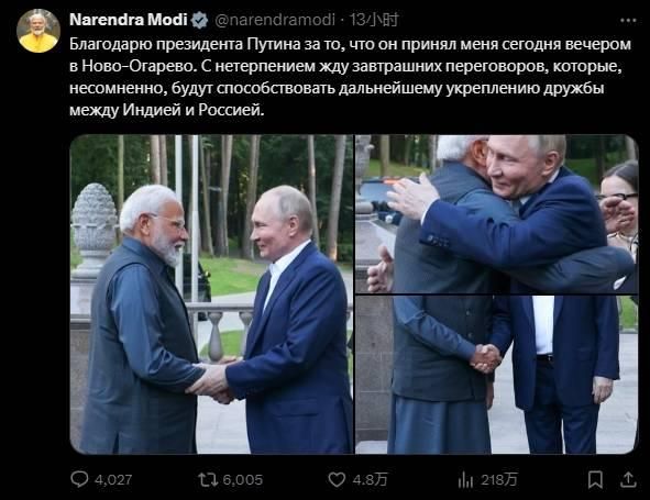 莫迪8日发布英俄双语推文称,“感谢总统的招待,我期待明天的会谈,这无疑将进一步加强印俄友谊”,同时附上了自己与普京握手并拥抱的图片。