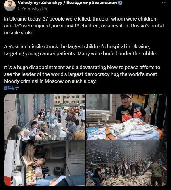 泽连斯基写道:“俄罗斯对乌克兰发动残酷导弹袭击,造成37人死亡,其中包括3名儿童,另有170人受伤,其中包括13名儿童。一枚俄罗斯导弹击中了乌克兰最大儿童医院,许多人被埋在废墟之下。”
