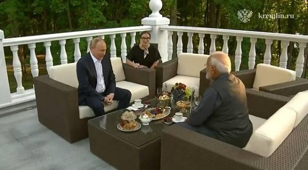 据俄新社和塔斯社报道,抵达莫斯科后,莫迪乘坐专车前往俄总统官邸。在那里,他与普京喝茶聊天,在没有口译员陪同的情况下在公园散步。克宫称,这是两国领导人之间的非正式交流,“非常有意义”。