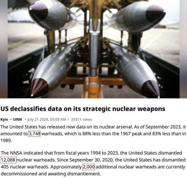 美国能源部下属的国家核安全管理局近日表示,截至2023年9月,美国核武库共有3748枚核弹头。从1994财年到2023财年,美国销毁了超过1.2万枚核弹头。另有2000枚核弹头已经淘汰并等待处置。